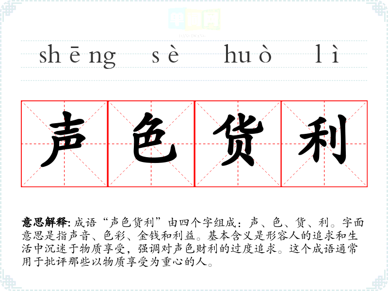 成语“声色货利”由四个字组成:声、色、货、利。字面意思是指声音、色彩、金钱和利益。基本含义是形容人的追求和生活中沉迷于物质享受,强调对声色财利的过度追求。这个成语通常用于批评那些以物质享受为重心的人。