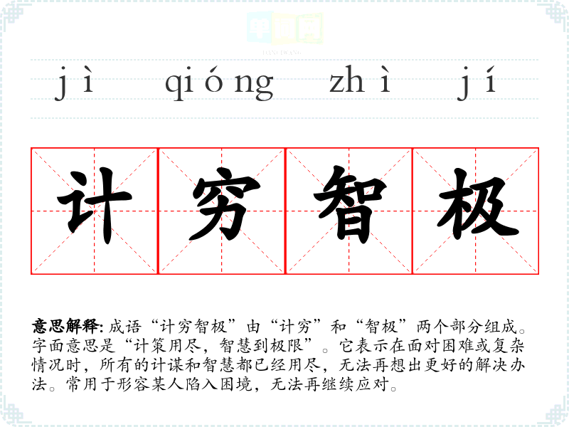 成语“计穷智极”由“计穷”和“智极”两个部分组成。字面意思是“计策用尽,智慧到极限”。它表示在面对困难或复杂情况时,所有的计谋和智慧都已经用尽,无法再想出更好的解决办法。常用于形容某人陷入困境,无法再继续应对。