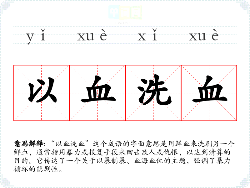 “以血洗血”这个成语的字面意思是用鲜血来洗刷另一个鲜血,通常指用暴力或报复手段来回击敌人或仇恨,以达到清算的目的。它传达了一个关于以暴制暴、血海血仇的主题,强调了暴力循环的悲剧性。