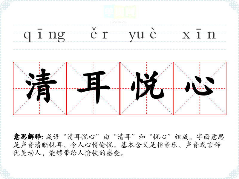 成语“清耳悦心”由“清耳”和“悦心”组成。字面意思是声音清晰悦耳,令人心情愉悦。基本含义是指音乐、声音或言辞优美动人,能够带给人愉快的感受。