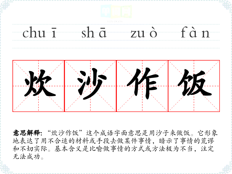 “炊沙作饭”这个成语字面意思是用沙子来做饭。它形象地表达了用不合适的材料或手段去做某件事情,暗示了事情的荒谬和不切实际。基本含义是比喻做事情的方式或方法极为不当,注定无法成功。