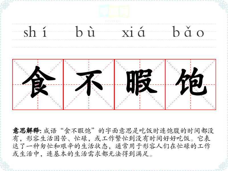 成语“食不暇饱”的字面意思是吃饭时连饱腹的时间都没有,形容生活困苦、忙碌,或工作繁忙到没有时间好好吃饭。它表达了一种匆忙和艰辛的生活状态,通常用于形容人们在忙碌的工作或生活中,连基本的生活需求都无法得到满足。