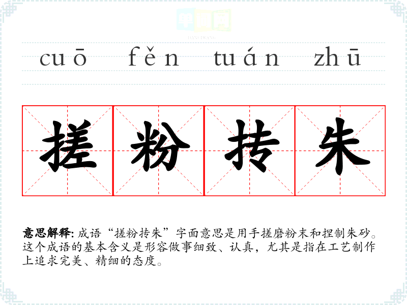 成语“搓粉抟朱”字面意思是用手搓磨粉末和捏制朱砂。这个成语的基本含义是形容做事细致、认真,尤其是指在工艺制作上追求完美、精细的态度。