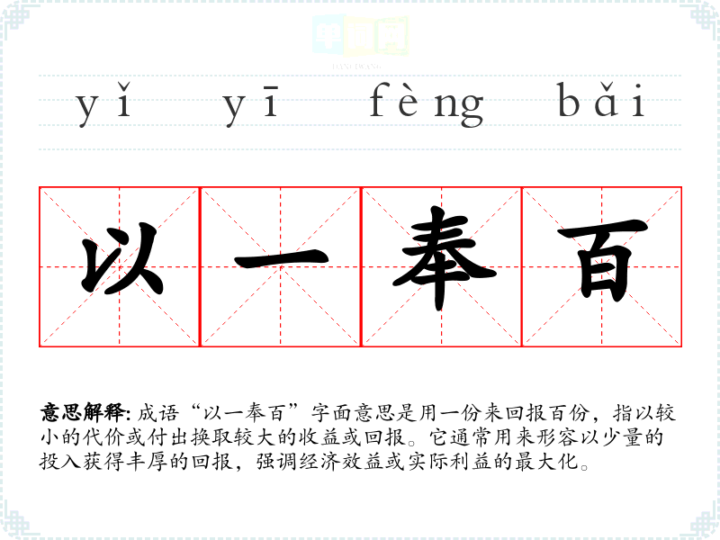 成语“以一奉百”字面意思是用一份来回报百份,指以较小的代价或付出换取较大的收益或回报。它通常用来形容以少量的投入获得丰厚的回报,强调经济效益或实际利益的最大化。