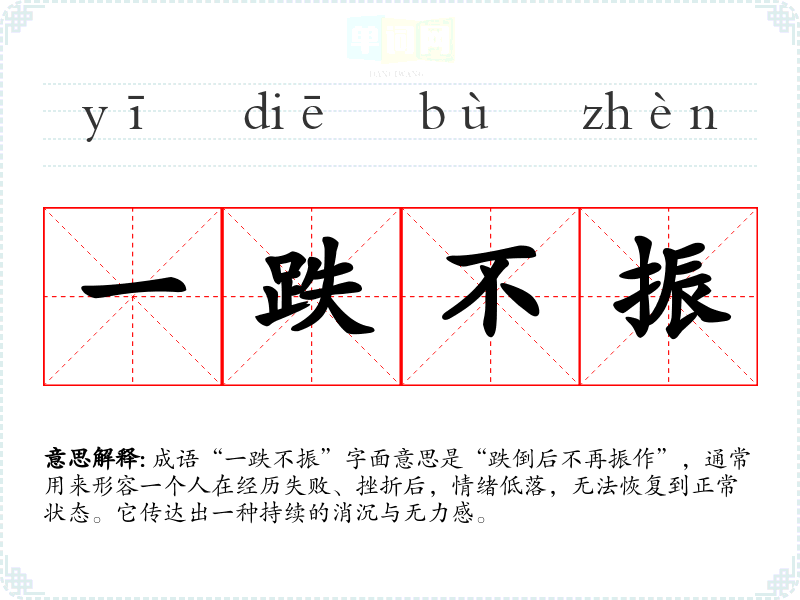 成语“一跌不振”字面意思是“跌倒后不再振作”,通常用来形容一个人在经历失败、挫折后,情绪低落,无法恢复到正常状态。它传达出一种持续的消沉与无力感。