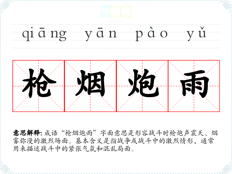 成语“枪烟炮雨”字面意思是形容战斗时枪炮声震天、烟雾弥漫的激烈场面。基本含义是指战争或战斗中的激烈情形,通常用来描述战斗中的紧张气氛和混乱局面。