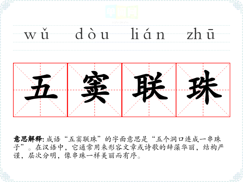 成语“五窦联珠”的字面意思是“五个洞口连成一串珠子”。在汉语中,它通常用来形容文章或诗歌的辞藻华丽,结构严谨,层次分明,像串珠一样美丽而有序。
