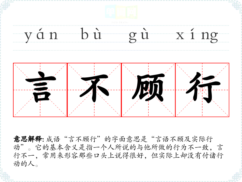 成语“言不顾行”的字面意思是“言语不顾及实际行动”。它的基本含义是指一个人所说的与他所做的行为不一致,言行不一,常用来形容那些口头上说得很好,但实际上却没有付诸行动的人。