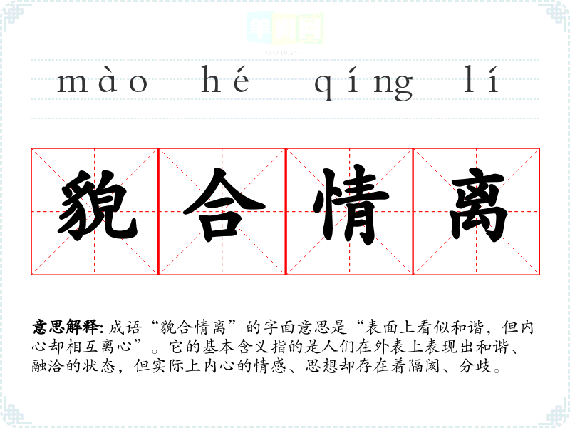 成语“貌合情离”的字面意思是“表面上看似和谐,但内心却相互离心”。它的基本含义指的是人们在外表上表现出和谐、融洽的状态,但实际上内心的情感、思想却存在着隔阂、分歧。