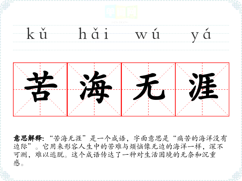 “苦海无涯”是一个成语,字面意思是“痛苦的海洋没有边际”。它用来形容人生中的苦难与烦恼像无边的海洋一样,深不可测,难以逃脱。这个成语传达了一种对生活困境的无奈和沉重感。