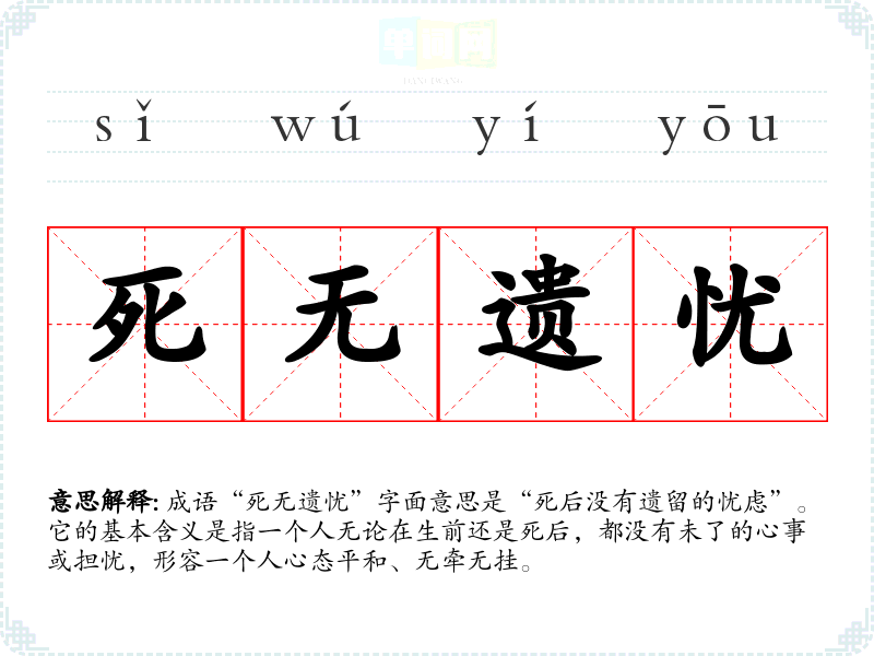 成语“死无遗忧”字面意思是“死后没有遗留的忧虑”。它的基本含义是指一个人无论在生前还是死后,都没有未了的心事或担忧,形容一个人心态平和、无牵无挂。
