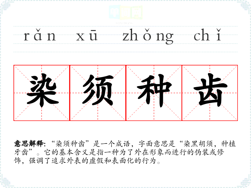 “染须种齿”是一个成语,字面意思是“染黑胡须,种植牙齿”。它的基本含义是指一种为了外在形象而进行的伪装或修饰,强调了追求外表的虚假和表面化的行为。