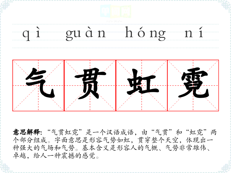 “气贯虹霓”是一个汉语成语,由“气贯”和“虹霓”两个部分组成。字面意思是形容气势如虹,贯穿整个天空,体现出一种强大的气场和气势。基本含义是形容人的气概、气势非常雄伟、卓越,给人一种震撼的感觉。