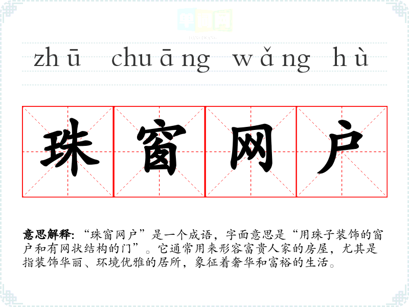 “珠窗网户”是一个成语,字面意思是“用珠子装饰的窗户和有网状结构的门”。它通常用来形容富贵人家的房屋,尤其是指装饰华丽、环境优雅的居所,象征着奢华和富裕的生活。