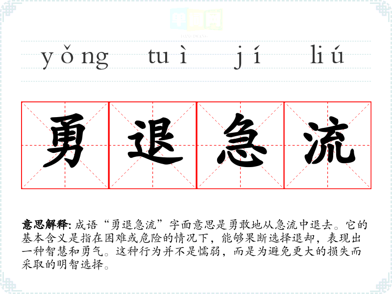 成语“勇退急流”字面意思是勇敢地从急流中退去。它的基本含义是指在困难或危险的情况下,能够果断选择退却,表现出一种智慧和勇气。这种行为并不是懦弱,而是为避免更大的损失而采取的明智选择。