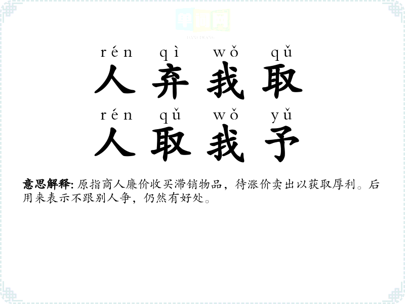 | 人取我与 | 取:拿;与:给。指商人囤积物资,待时出售以获厚利。 |