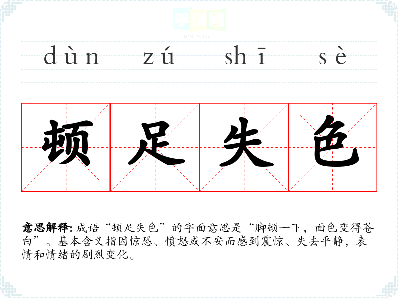 成语“顿足失色”的字面意思是“脚顿一下,面色变得苍白”。基本含义指因惊恐、愤怒或不安而感到震惊、失去平静,表情和情绪的剧烈变化。