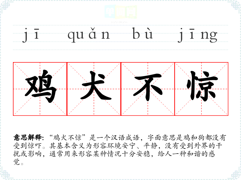 “鸡犬不惊”是一个汉语成语,字面意思是鸡和狗都没有受到惊吓。其基本含义为形容环境安宁、平静,没有受到外界的干扰或影响,通常用来形容某种情况十分安稳,给人一种和谐的感觉。
