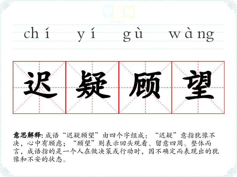 成语“迟疑顾望”由四个字组成:“迟疑”意指犹豫不决,心中有顾虑;“顾望”则表示回头观看、留意四周。整体而言,成语指的是一个人在做决策或行动时,因不确定而表现出的犹豫和不安的状态。