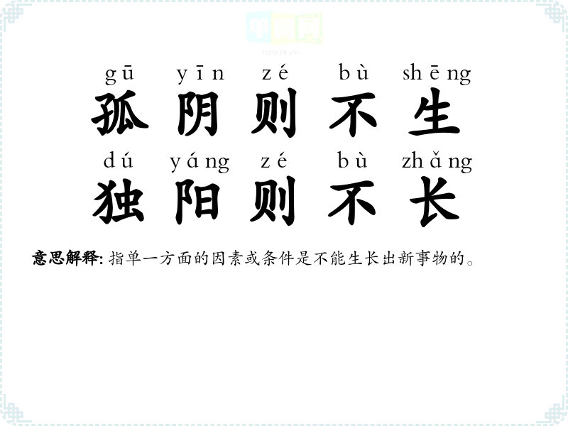 | 一阴一阳之谓道 | 阴、阳:指事物矛盾的两个对立面;道:事物发展的规律。既有阴,又有阳,这就是道,即事物发展的规律。 |