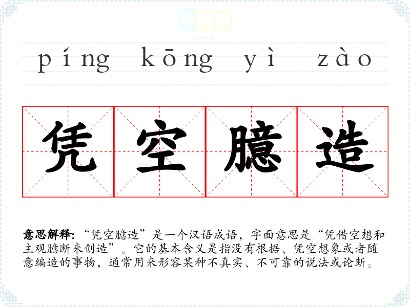 “凭空臆造”是一个汉语成语,字面意思是“凭借空想和主观臆断来创造”。它的基本含义是指没有根据、凭空想象或者随意编造的事物,通常用来形容某种不真实、不可靠的说法或论断。
