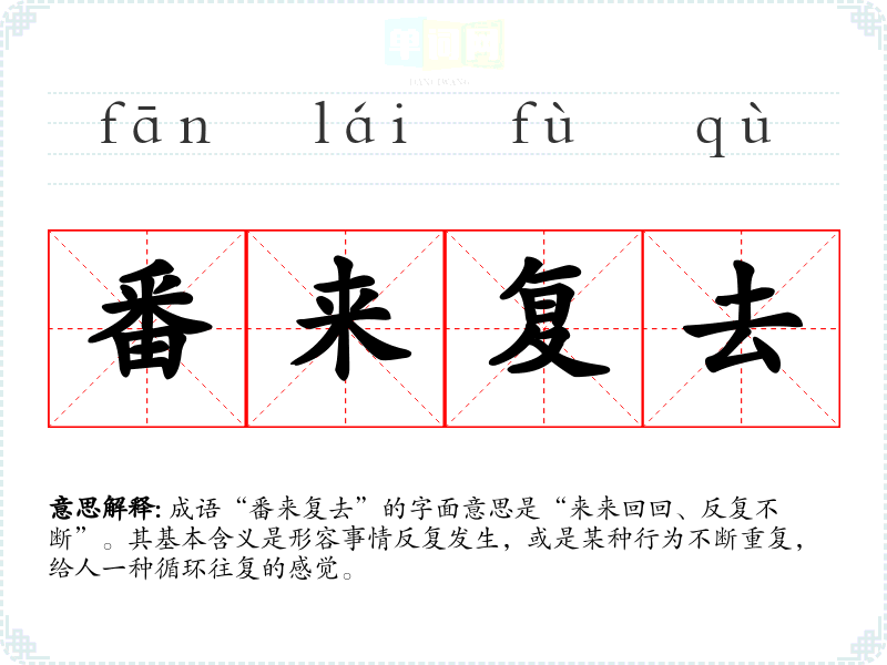 成语“番来复去”的字面意思是“来来回回、反复不断”。其基本含义是形容事情反复发生,或是某种行为不断重复,给人一种循环往复的感觉。