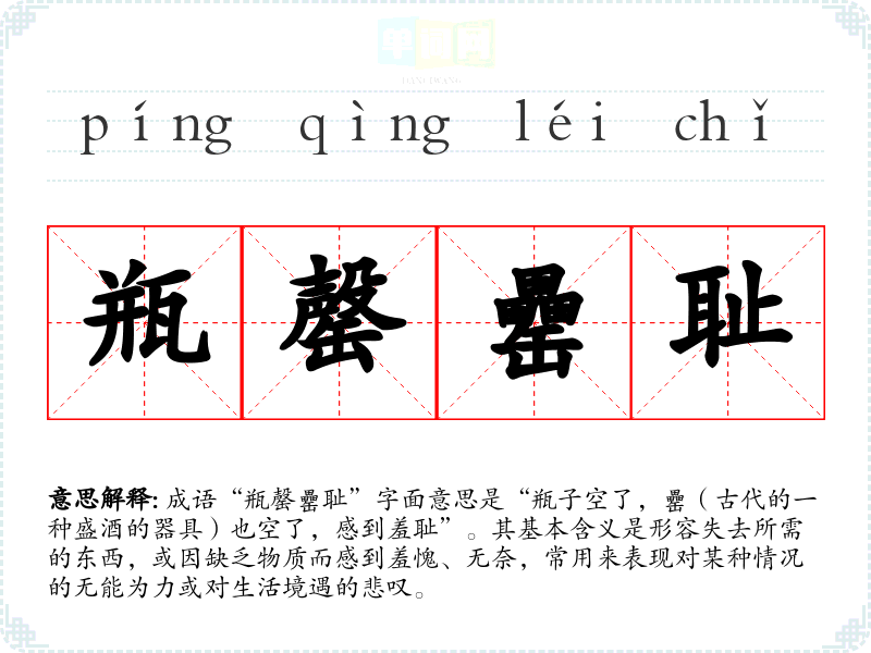 成语“瓶罄罍耻”字面意思是“瓶子空了,罍(古代的一种盛酒的器具)也空了,感到羞耻”。其基本含义是形容失去所需的东西,或因缺乏物质而感到羞愧、无奈,常用来表现对某种情况的无能为力或对生活境遇的悲叹。