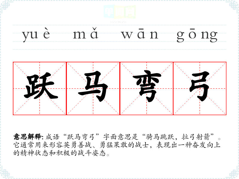 成语“跃马弯弓”字面意思是“骑马跳跃,拉弓射箭”。它通常用来形容英勇善战、勇猛果敢的战士,表现出一种奋发向上的精神状态和积极的战斗姿态。