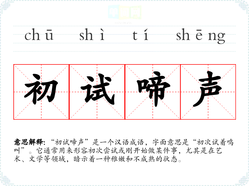 “初试啼声”是一个汉语成语,字面意思是“初次试着鸣叫”。它通常用来形容初次尝试或刚开始做某件事,尤其是在艺术、文学等领域,暗示着一种稚嫩和不成熟的状态。