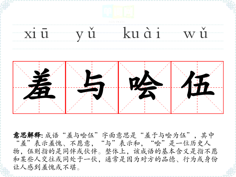成语“羞与哙伍”字面意思是“羞于与哙为伍”,其中“羞”表示羞愧、不愿意,“与”表示和,“哙”是一位历史人物,伍则指的是同伴或伙伴。整体上,该成语的基本含义是指不愿和某些人交往或同处于一伙,通常是因为对方的品德、行为或身份让人感到羞愧或不堪。