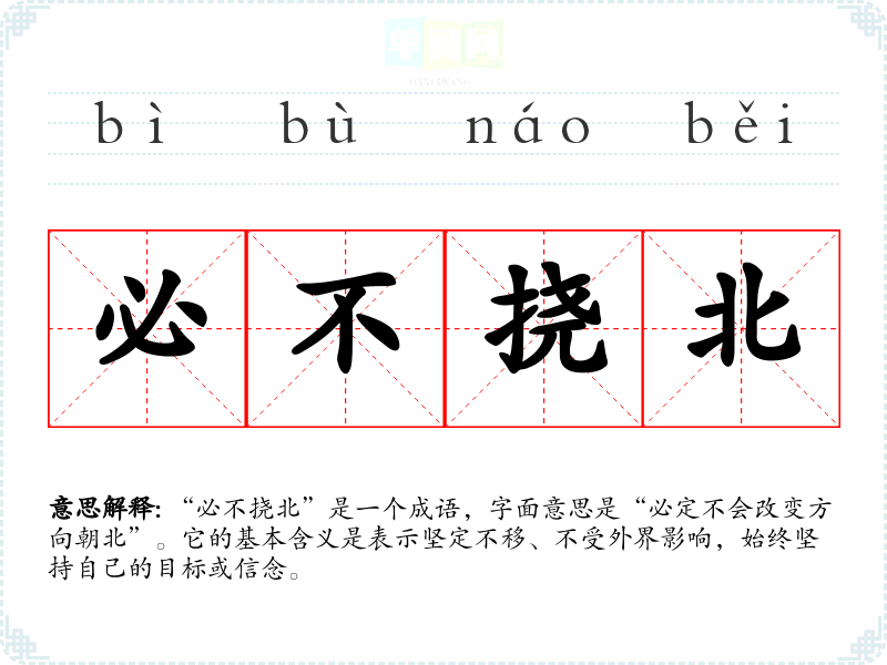 “必不挠北”是一个成语,字面意思是“必定不会改变方向朝北”。它的基本含义是表示坚定不移、不受外界影响,始终坚持自己的目标或信念。