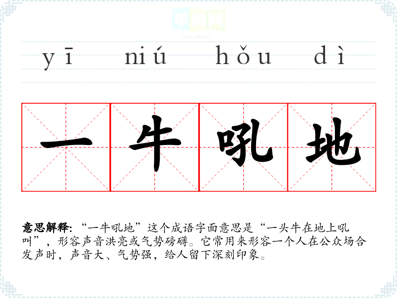 “一牛吼地”这个成语字面意思是“一头牛在地上吼叫”,形容声音洪亮或气势磅礴。它常用来形容一个人在公众场合发声时,声音大、气势强,给人留下深刻印象。