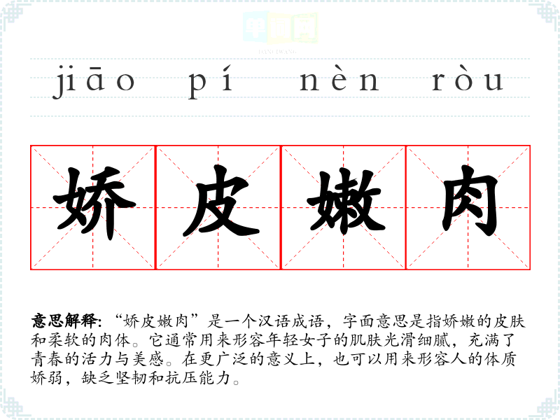 “娇皮嫩肉”是一个汉语成语,字面意思是指娇嫩的皮肤和柔软的肉体。它通常用来形容年轻女子的肌肤光滑细腻,充满了青春的活力与美感。在更广泛的意义上,也可以用来形容人的体质娇弱,缺乏坚韧和抗压能力。