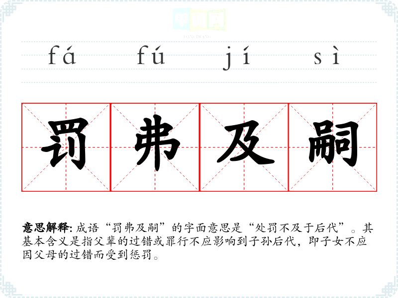 成语“罚弗及嗣”的字面意思是“处罚不及于后代”。其基本含义是指父辈的过错或罪行不应影响到子孙后代,即子女不应因父母的过错而受到惩罚。