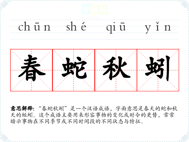 该成语通常用于描述事物在不同时间段的变化,适用于文学作品、日常对话以及演讲等场合。例如,在谈论自然现象、季节变化、社会变迁等时,可以运用“春蛇秋蚓”来增强表达的生动性。
