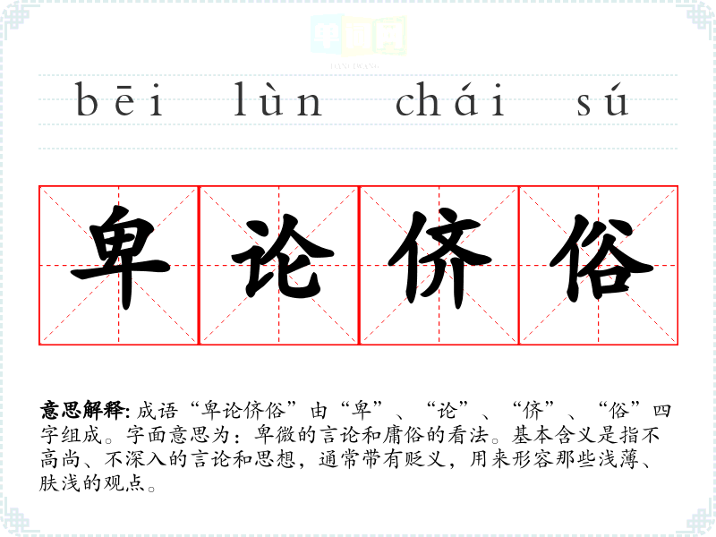 成语“卑论侪俗”由“卑”、“论”、“侪”、“俗”四字组成。字面意思为:卑微的言论和庸俗的看法。基本含义是指不高尚、不深入的言论和思想,通常带有贬义,用来形容那些浅*、肤浅的观点。