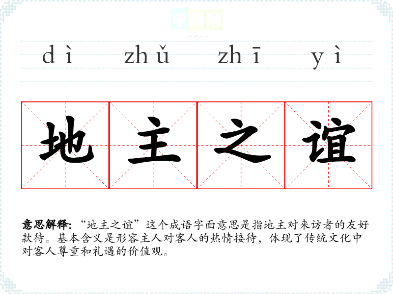 “地主之谊”这个成语字面意思是指地主对来访者的友好款待。基本含义是形容主人对客人的热情接待,体现了传统文化中对客人尊重和礼遇的价值观。