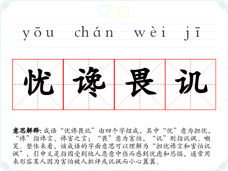 成语“忧谗畏讥”由四个字组成,其中“忧”意为担忧,“谗”指谗言、谗害之言;“畏”意为害怕,“讥”则指讥讽、嘲笑。整体来看,该成语的字面意思可以理解为“担忧谗言和害怕讥讽”,引申义是指因受到他人恶意中伤而感到忧虑和恐惧,通常用来形容某人因为害怕被人批评或讥讽而小心翼翼。