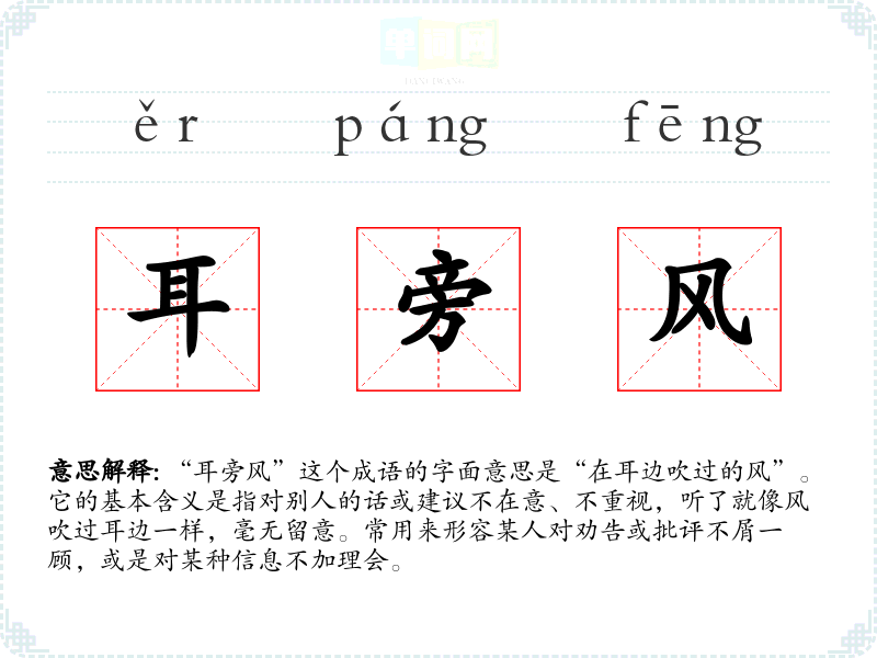 “耳旁风”这个成语的字面意思是“在耳边吹过的风”。它的基本含义是指对别人的话或建议不在意、不重视,听了就像风吹过耳边一样,毫无留意。常用来形容某人对劝告或批评不屑一顾,或是对某种信息不加理会。