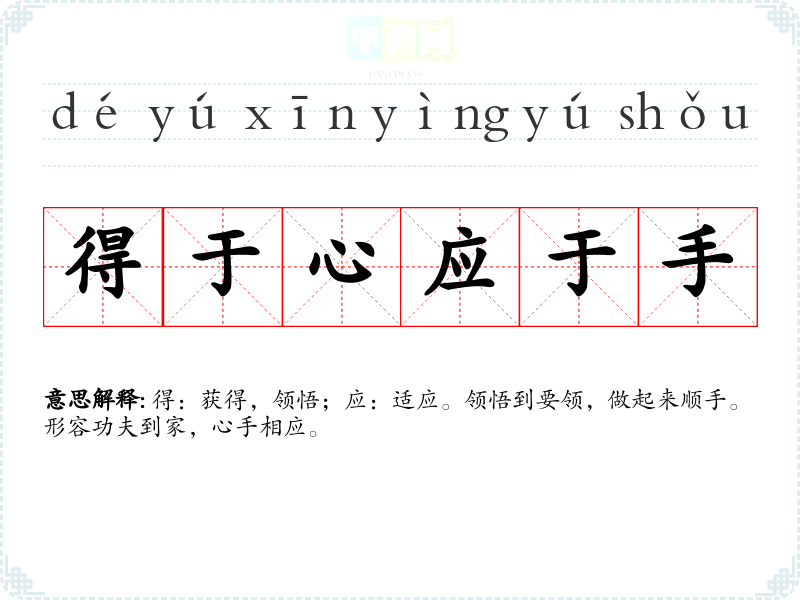 | 得于心应于手 | 得:获得,领悟;应:适应。领悟到要领,做起来顺手。形容功夫到家,心手相应。 |