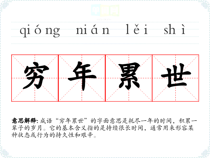 成语“穷年累世”的字面意思是耗尽一年的时间,积累一辈子的岁月。它的基本含义指的是持续很长时间,通常用来形容某种状态或行为的持久性和艰辛。