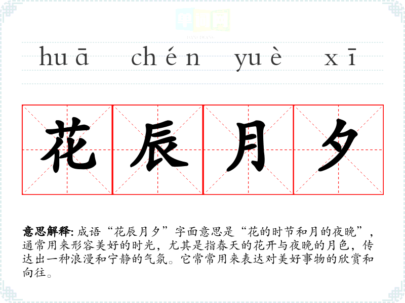 成语“花辰月夕”字面意思是“花的时节和月的夜晚”,通常用来形容美好的时光,尤其是指春天的花开与夜晚的月色,传达出一种浪漫和宁静的气氛。它常常用来表达对美好事物的欣赏和向往。