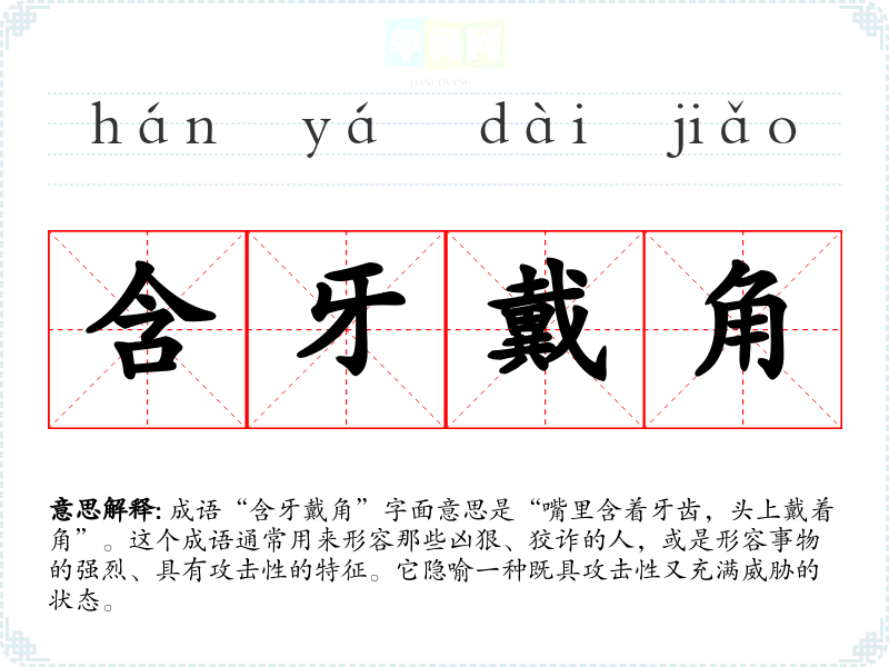成语“含牙戴角”字面意思是“嘴里含着牙齿,头上戴着角”。这个成语通常用来形容那些凶狠、狡诈的人,或是形容事物的强烈、具有攻击性的特征。它隐喻一种既具攻击性又充满威胁的状态。