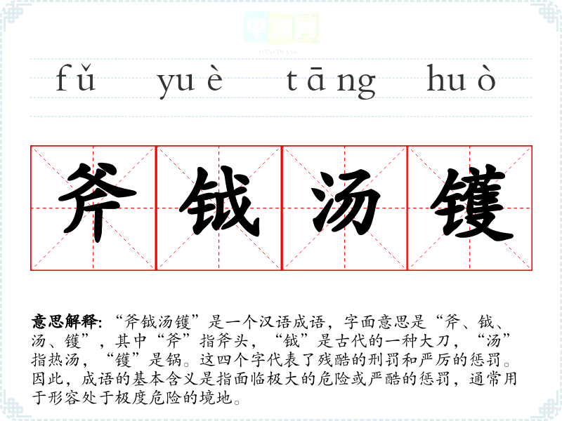 | 斧钺汤镬 | 斧钺:古代军中刑戮。汤:滚开的水。镬:古代的大锅。汤镬:古代一种酷刑,把犯人投入滚水中煮死。指各种酷刑。 |