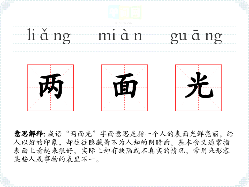 成语“两面光”字面意思是指一个人的表面光鲜亮丽,给人以好的印象,却往往隐藏着不为人知的阴暗面。基本含义通常指表面上看起来很好,实际上却有缺陷或不真实的情况,常用来形容某些人或事物的表里不一。
