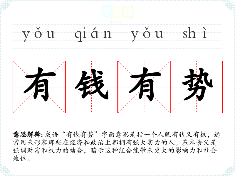 成语“有钱有势”字面意思是指一个人既有钱又有权,通常用来形容那些在经济和政治上都拥有强大实力的人。基本含义是强调财富和权力的结合,暗示这种组合能带来更大的影响力和社会地位。