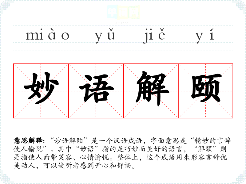 “妙语解颐”是一个汉语成语,字面意思是“精妙的言辞使人愉悦”。其中“妙语”指的是巧妙而美好的语言,“解颐”则是指使人面带笑容、心情愉悦。整体上,这个成语用来形容言辞优美动人,可以使听者感到开心和舒畅。