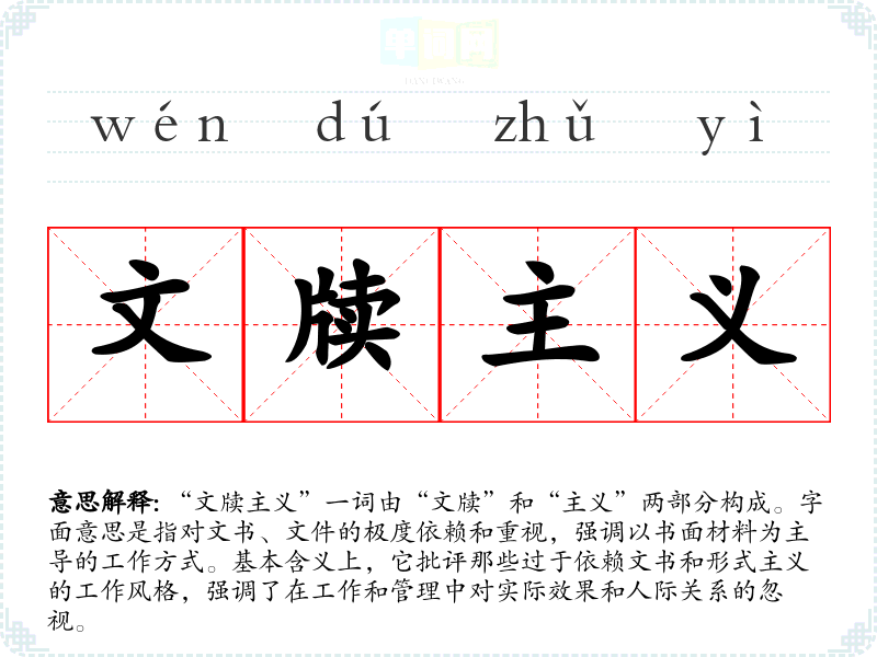 “文牍主义”一词由“文牍”和“主义”两部分构成。字面意思是指对文书、文件的极度依赖和重视,强调以书面材料为主导的工作方式。基本含义上,它批评那些过于依赖文书和形式主义的工作风格,强调了在工作和管理中对实际效果和人际关系的忽视。