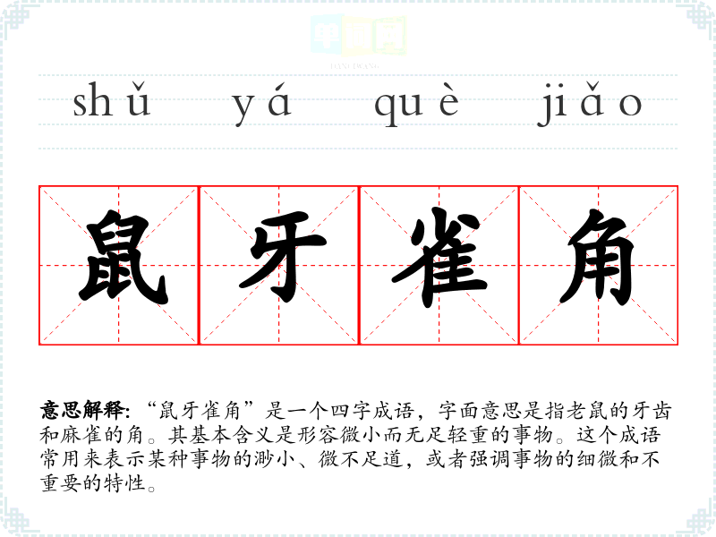 - 日常对话:在日常交流中,人们可能会用这个成语来调侃某件事的无足轻重,比如“这件事根本是鼠牙雀角,不值得我们花时间去讨论。”