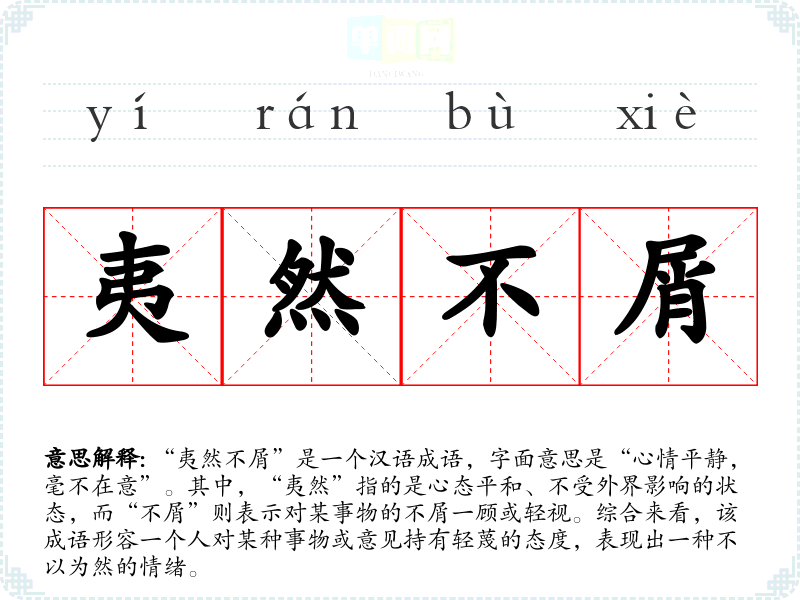 通过对“夷然不屑”的学习,我更加理解了在日常交流中表达态度的重要性。这个成语不仅丰富了我的词汇,也让我在面对压力时学会了保持内心的从容与坚定,帮助我在语言学习和表达中更加自信。